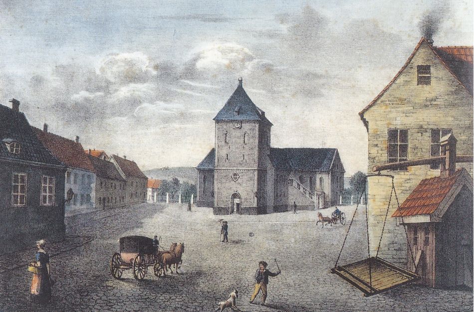 Siden Aker var sentralgården og en av de tidligste i bygda med fast bosetning, var det god grunn til å legge kirken her, på en dominerende høyde med utsikt til (og synlig fra) store deler av sognet. Kirkestedet lå også midt i Akersdalen, godt tilgjengelig for hele menigheten ved et naturlig vadested over Akerselva. Derfor gikk også middelalderens landevei vestover fra Oslo rett forbi kirken, opp Akersbakken (som før 1879 het Kirkeveien) og fortsatte langs en trasé som fremdeles er bevart i strekninger av gatene Dalsbergstien, Underhaugsveien og Professor Dahls gate. For mange pilegrimer på vei til Nidaros gikk pilegrimsleden av den grunn forbi Aker kirke. (Kilde: Wikipedia)